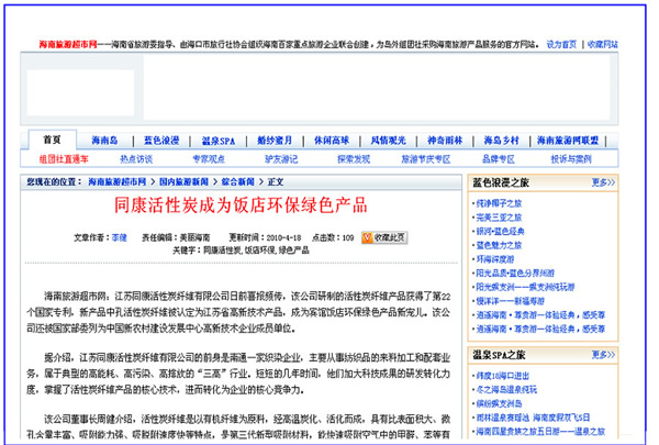 海南旅游超市網、天府熱線網——同康活性碳成為飯店環保綠色產品