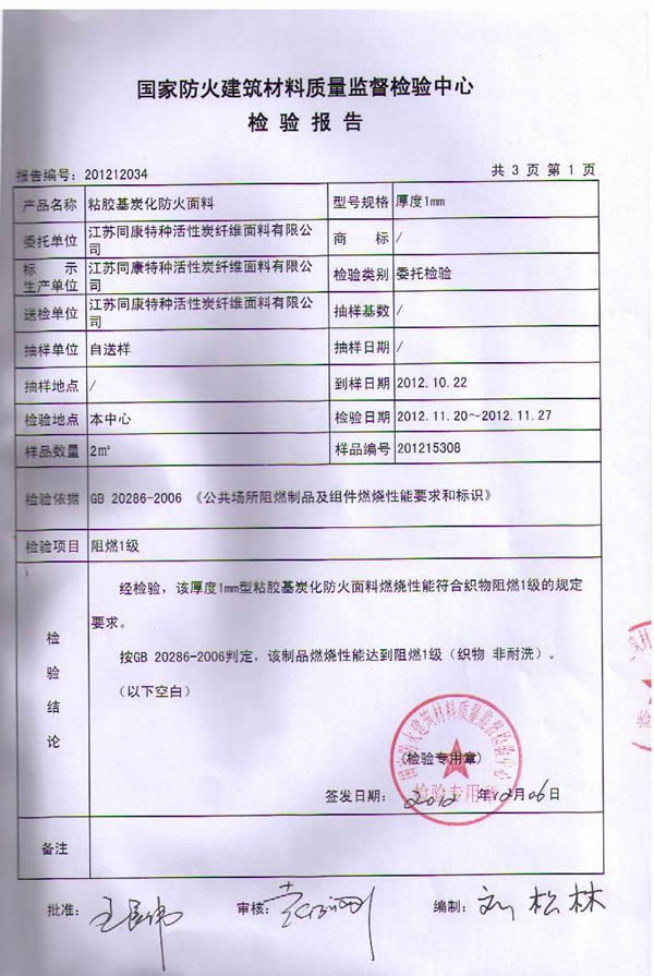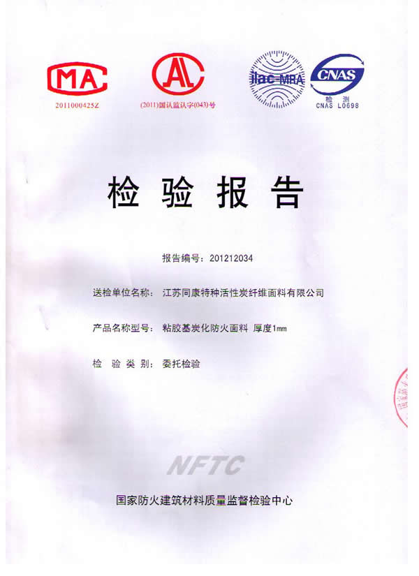 按國家標準GB 20286-2006《公共場所阻燃制品及組件燃燒性能要求和標識》判定,我公司研制的粘膠基炭化防火面料燃燒性能符合織物阻燃1級的規定要求,燃燒性能達到阻燃1級。該炭化防火面料由粘膠纖維織物為原料,經浸漬,炭化處理而成,具有耐高溫、耐明火,無陰燃,無續燃,無毒無害的特點,具有永久性阻燃功能。