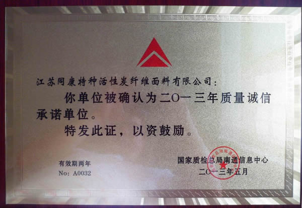 我公司被國家質檢總局南通信息中心確認為二O一三年質量誠信承諾單位。